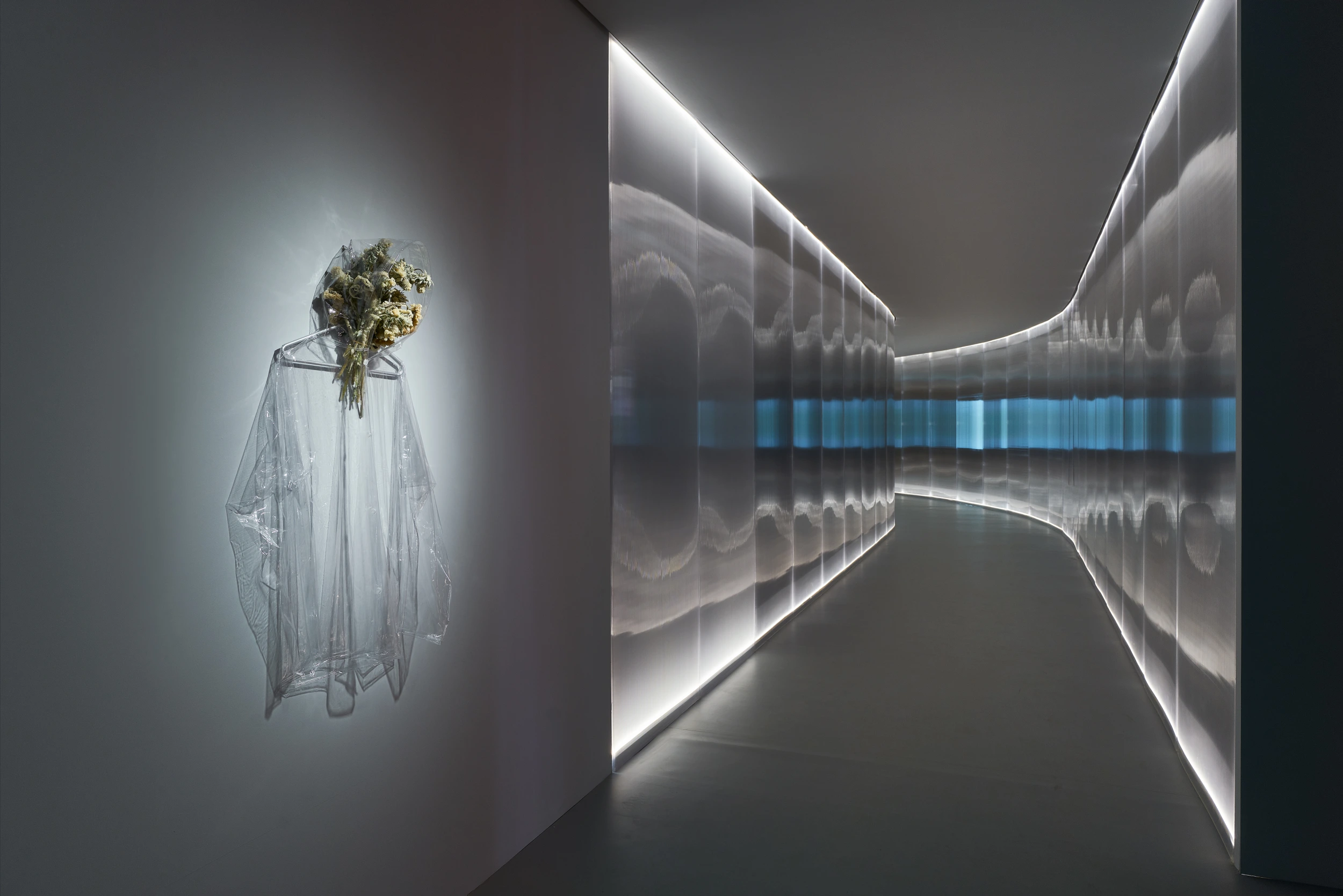 This exhibition—Yi’s first major exhibition in Beijing and the most comprehensive survey of her work to date—unfolds across spaces that evoke laboratories, spacecraft, and corporate interiors, heightening the tension between containment and interdependence. Anchoring the survey is Mr. Taxi for GG (2012), an early work that signals Yi’s enduring interest in impermanence and the porous boundaries between human and nonhuman entities. Subsequent projects expand these concerns into scent (Walking on Two Paths at Once, 2023), sculptural series such as the luminous Kelp Pods and animatronic Radiolaria, and Another You (2024), which employs genetically engineered bacteria to challenge conventional notions of kinship and identity.